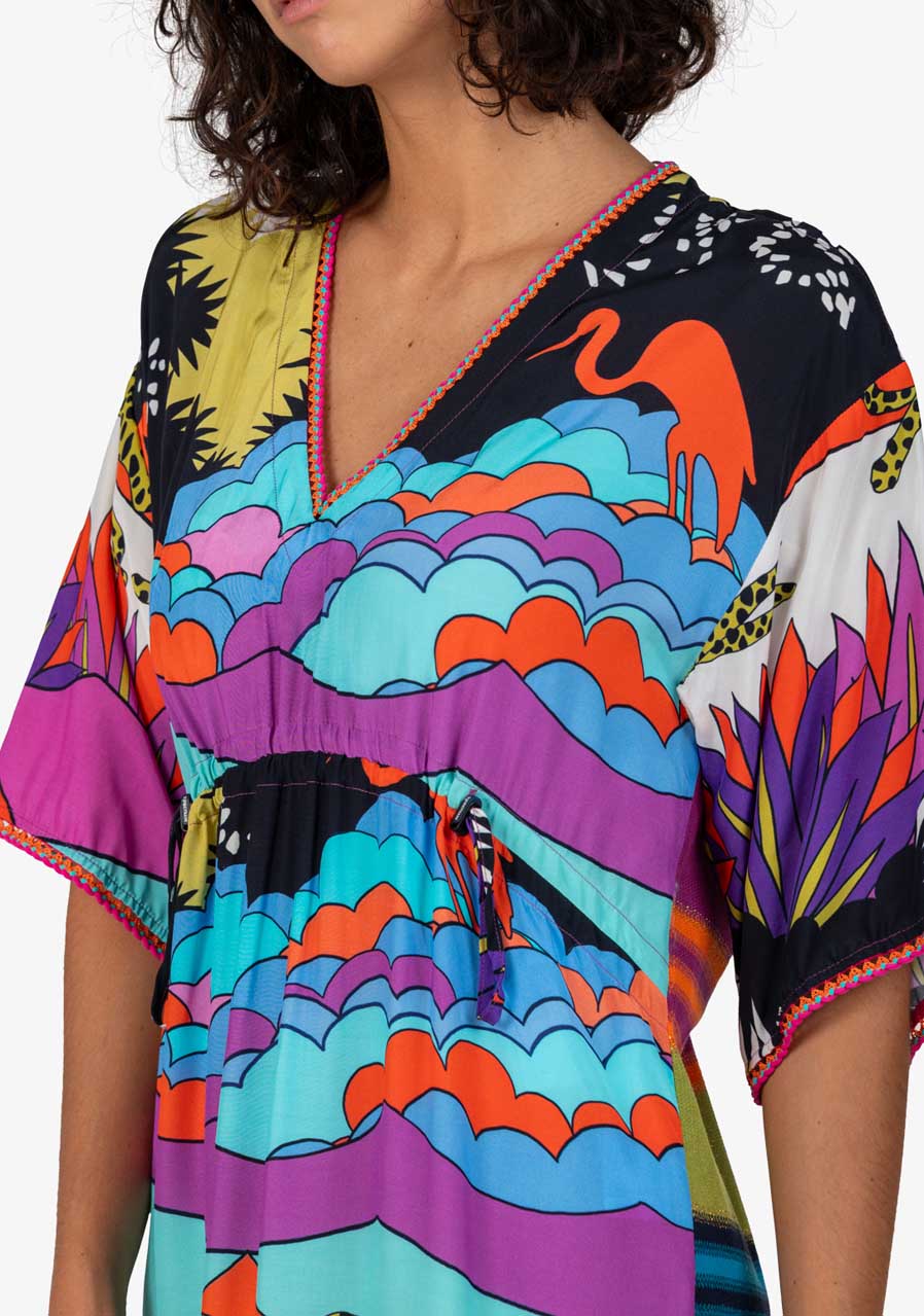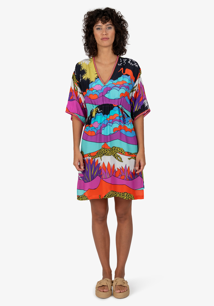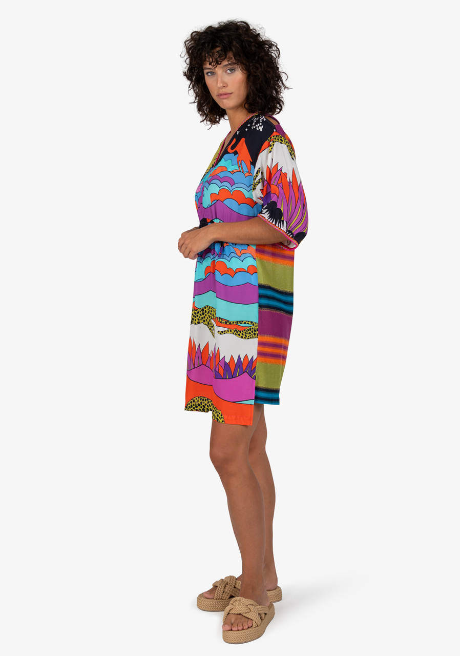 Tyto krátké tunikové šaty kombinují lehkost letního stylu s moderní elegancí. Barevný potisk v kombinaci s pruhovaným úpletem vytváří svěží a ženský vzhled. Sofistikovaný volán v pase a volný střih podtrhují ležérní pohodlí, zatímco kvalitní materiál z viskózy a úpletu zajišťuje příjemný pocit při nošení. Ideální pro volný čas, dovolenou i městské letní dny.