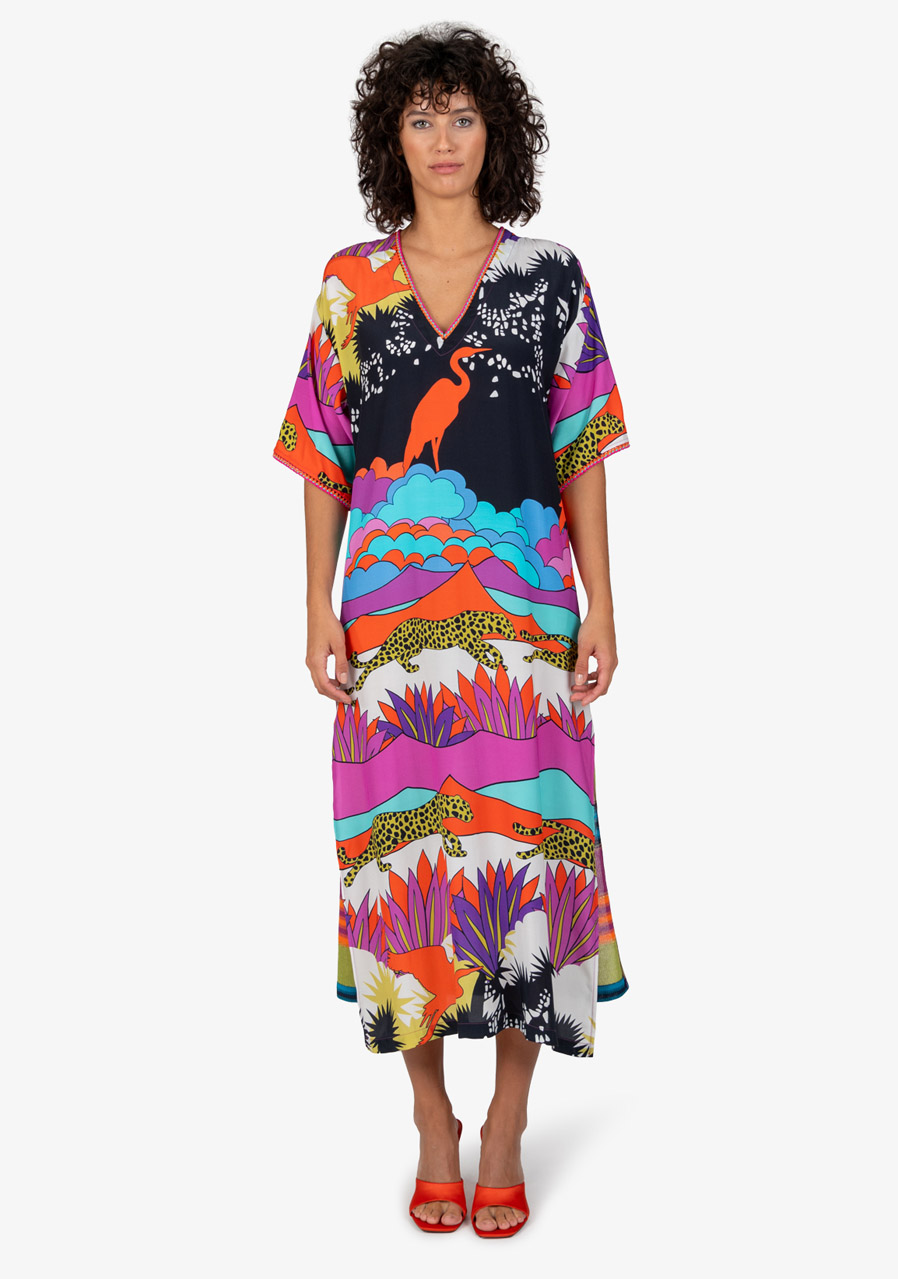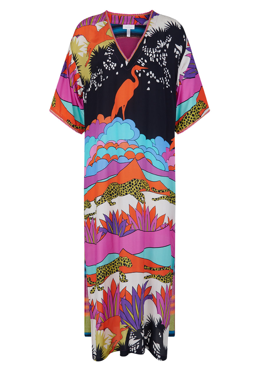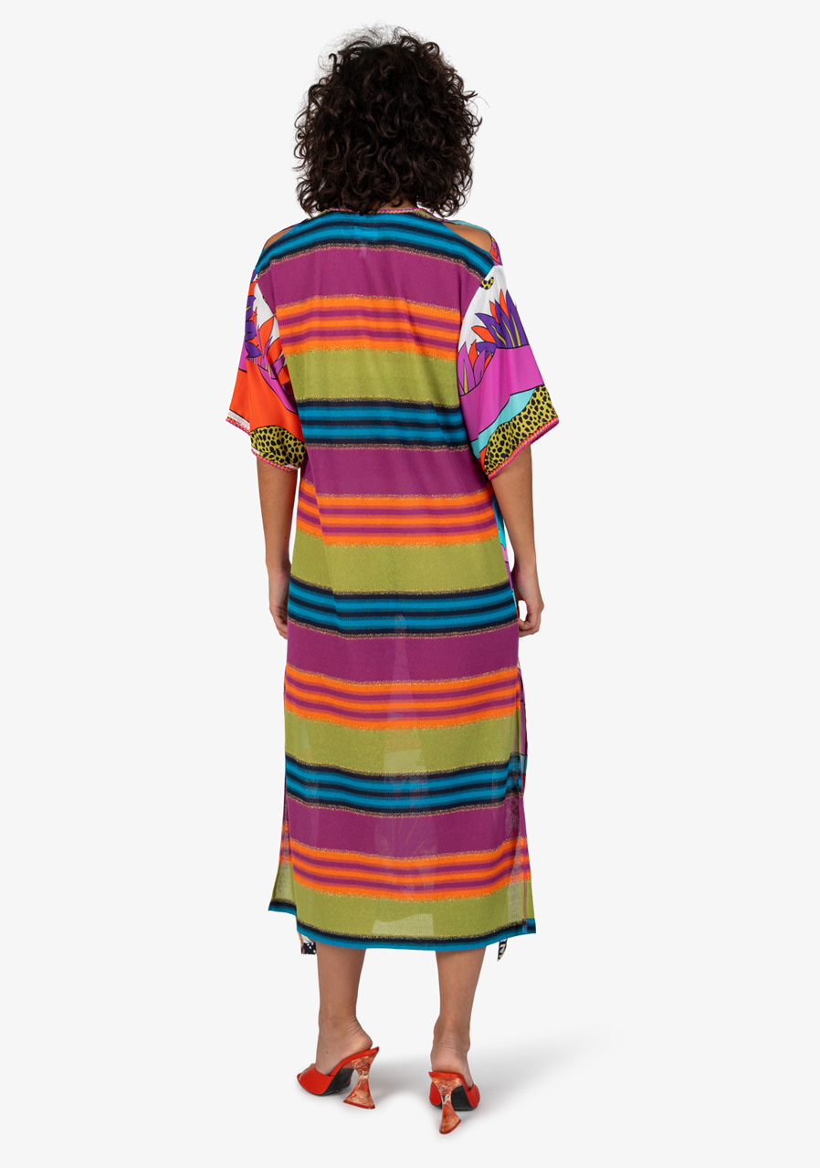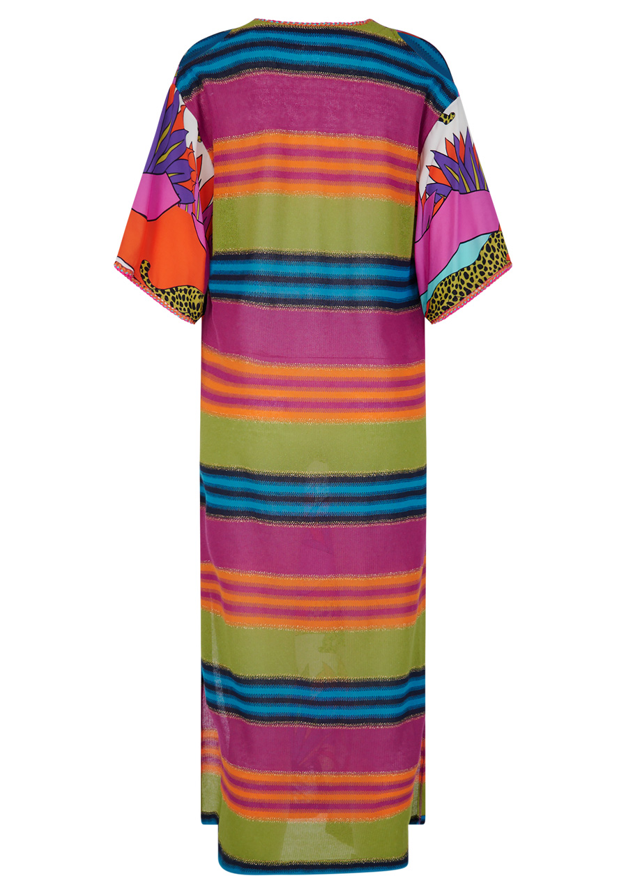Tyto barevné maxi šaty vynikají exkluzivním potiskem a sofistikovaným střihem. Kombinace zářivých barev, pruhovaného úpletu a letní viskózy vytváří lehký, ženský vzhled, který se skvěle hodí pro teplé dny. Díky pohodlnému materiálu a promyšleným detailům jsou tyto šaty ideální volbou pro dovolenou, volný čas i stylové městské outfity.