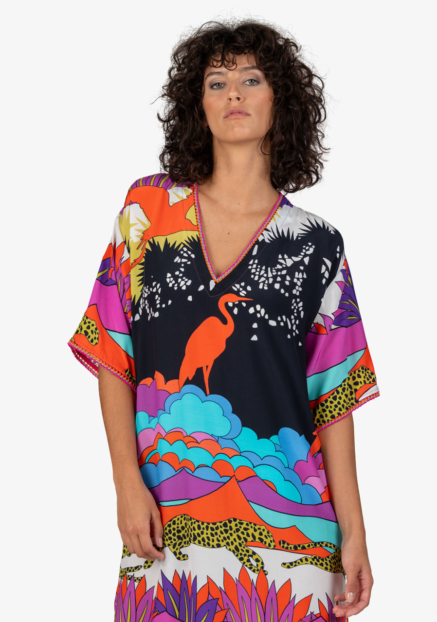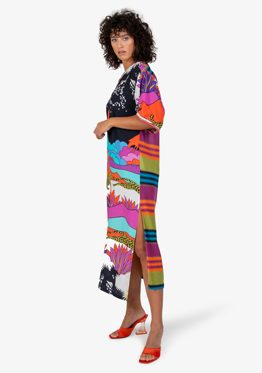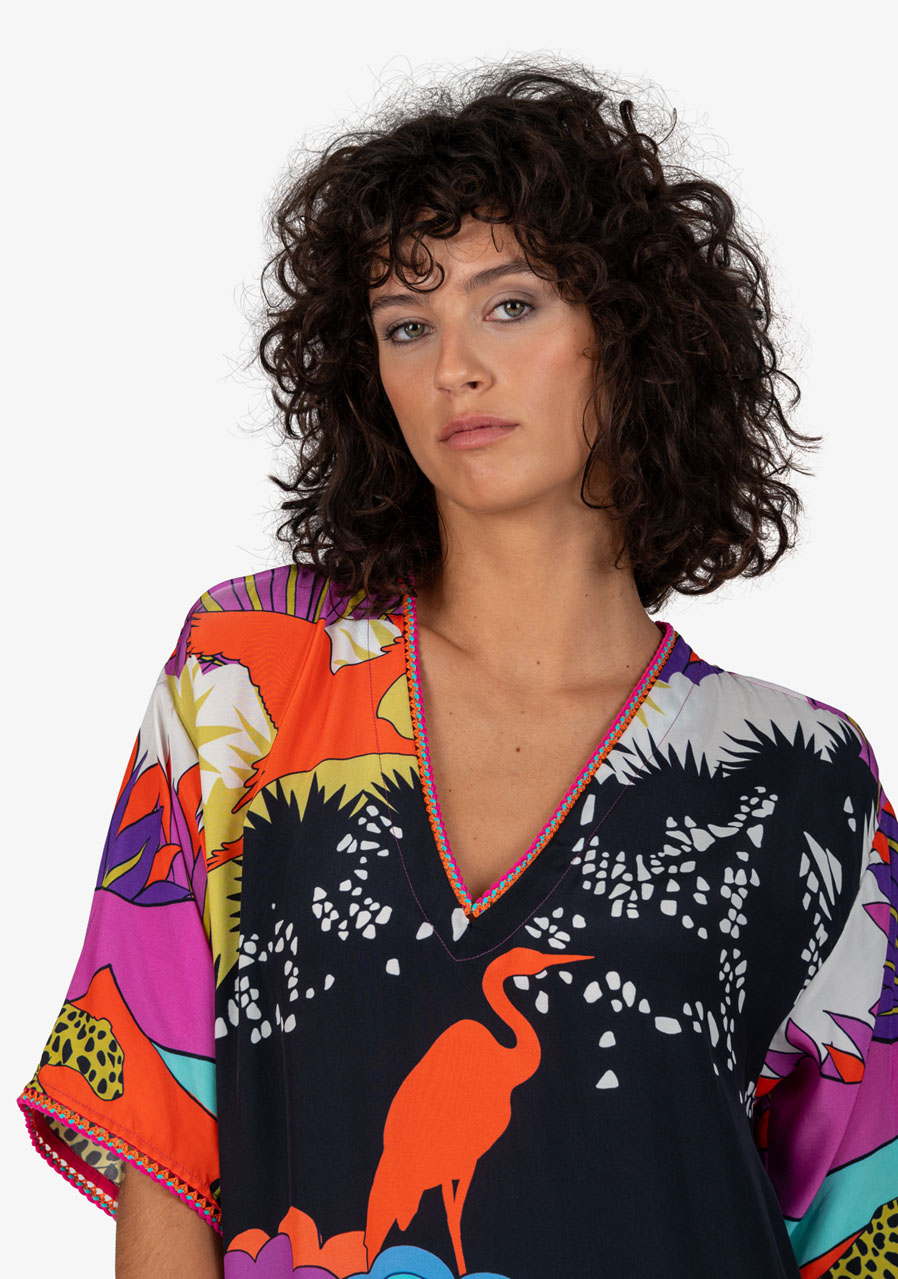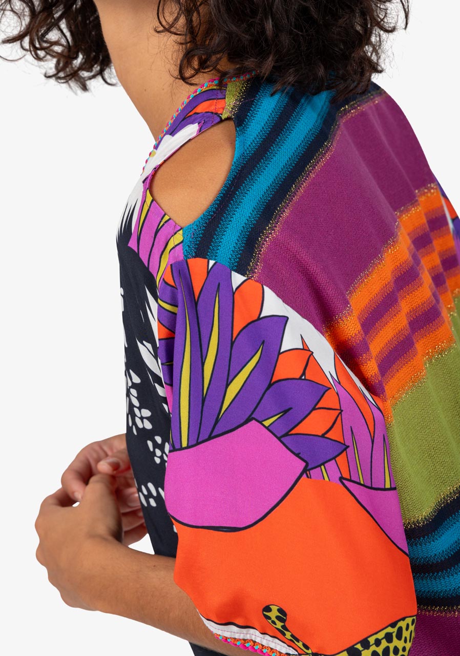 Materiál: letní viskóza v kombinaci s jemným úpletem Vzor: exkluzivní celoplošný potisk a pruhovaný úplet Střih: volný Styl: módní, ženský Výstřih: do V Rukávy: rukávy s širokým lemem a elastickým lemováním Zvýraznění: vysoké boční rozparky