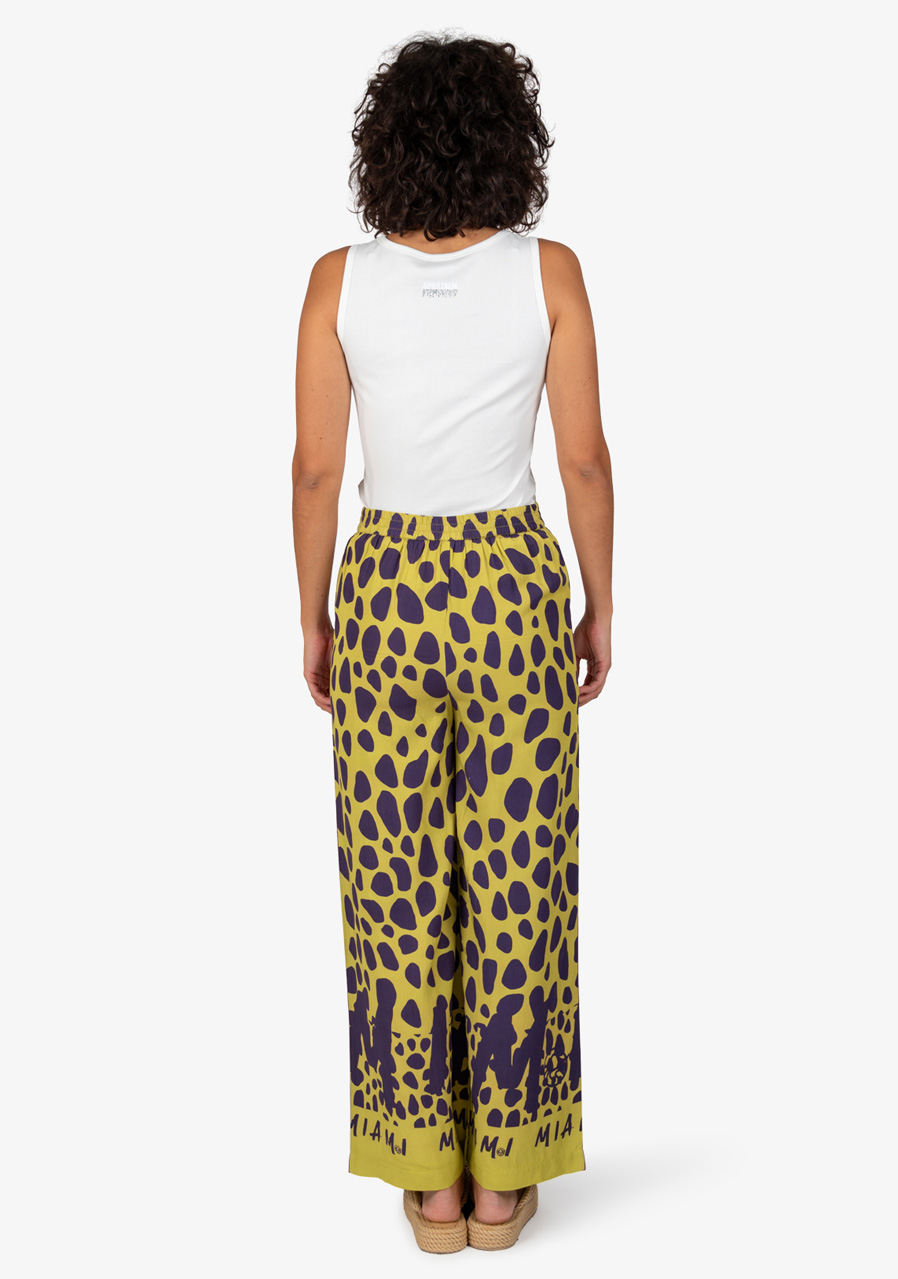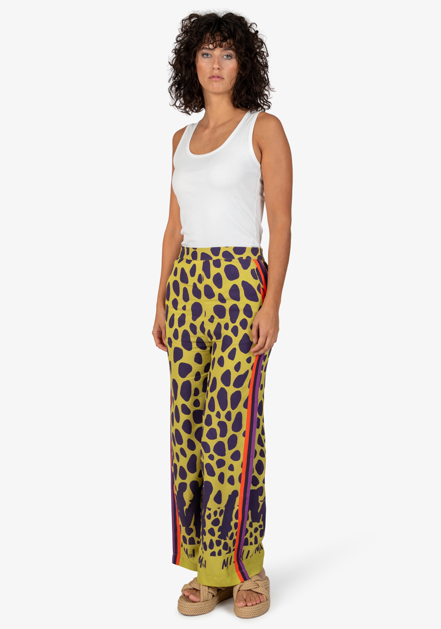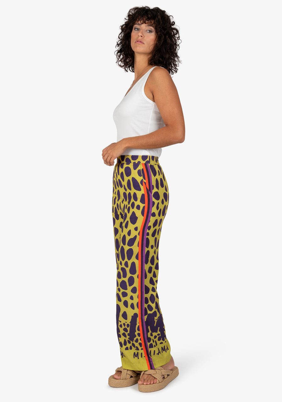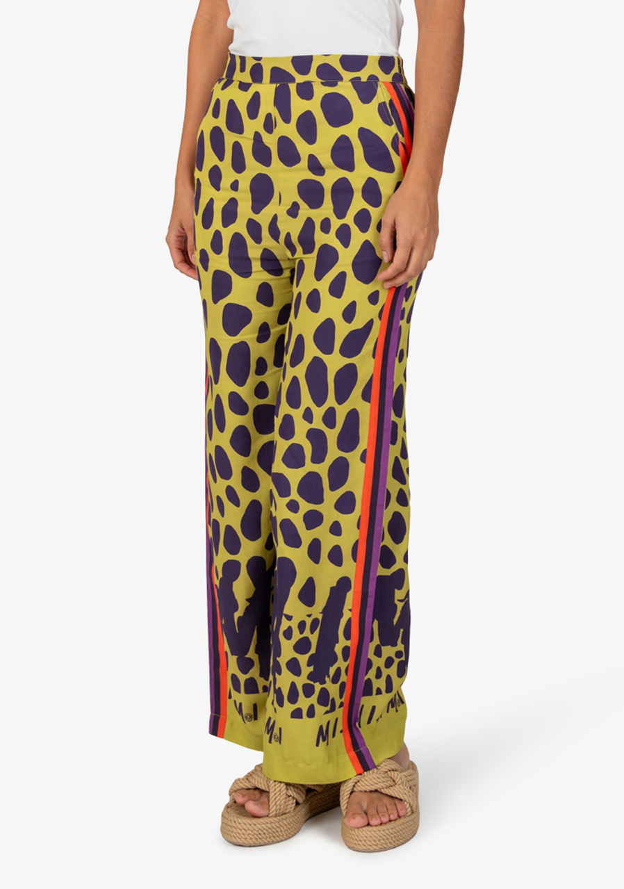 Materiál: vysoce kvalitní viskóza Vzor: extravagantní celoplošný potisk Střih: volný Styl: moderní, ležérní Pas: elastický Tvar nohavice: široký Kapsy: boční kapsy