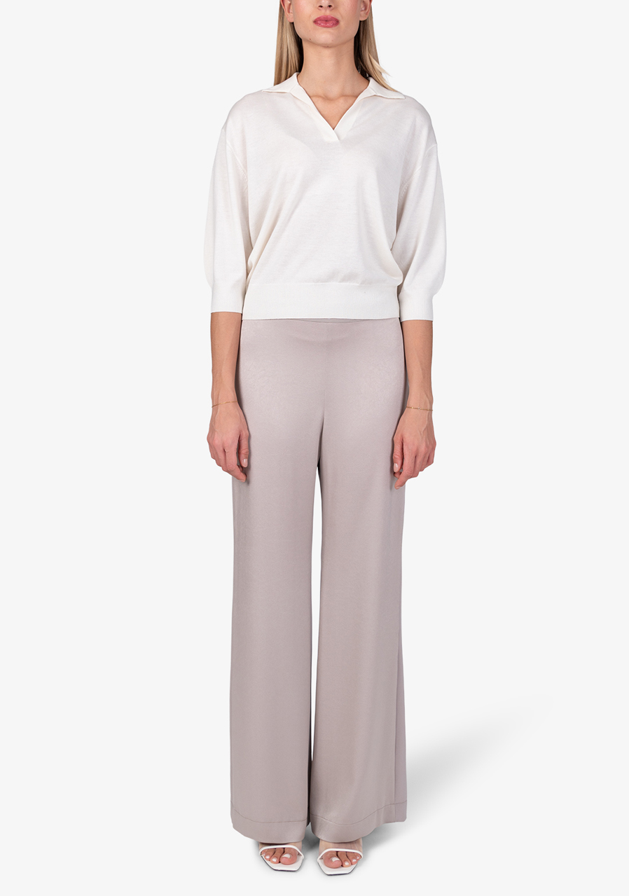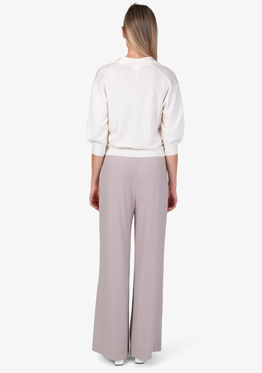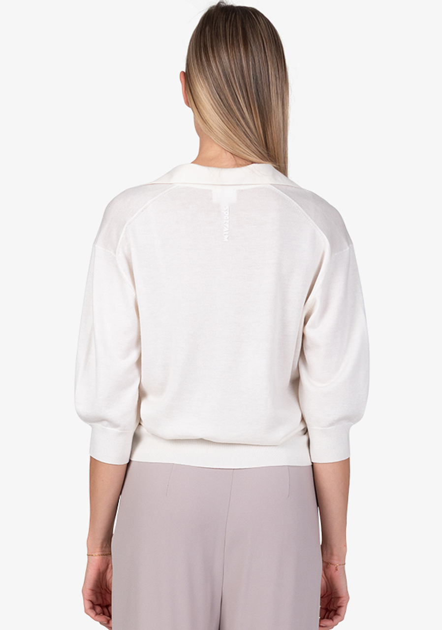 Ležérní svetr ve stylu polo zaujme nadčasovým designem a mimořádným komfortem při nošení. Je vyroben z vysoce kvalitní směsi merino vlny, hedvábí a kašmíru, která je příjemně měkká, hřejivá a zároveň lehká. Přiléhavý střih podtrhuje siluetu, zatímco spadlá ramena a jemný úplet dodávají moderní, uvolněný vzhled. Výstřih do V s polo límcem a výrazné žebrované lemy doplňuje silikonový nápis Sportalm uprostřed zadního dílu.