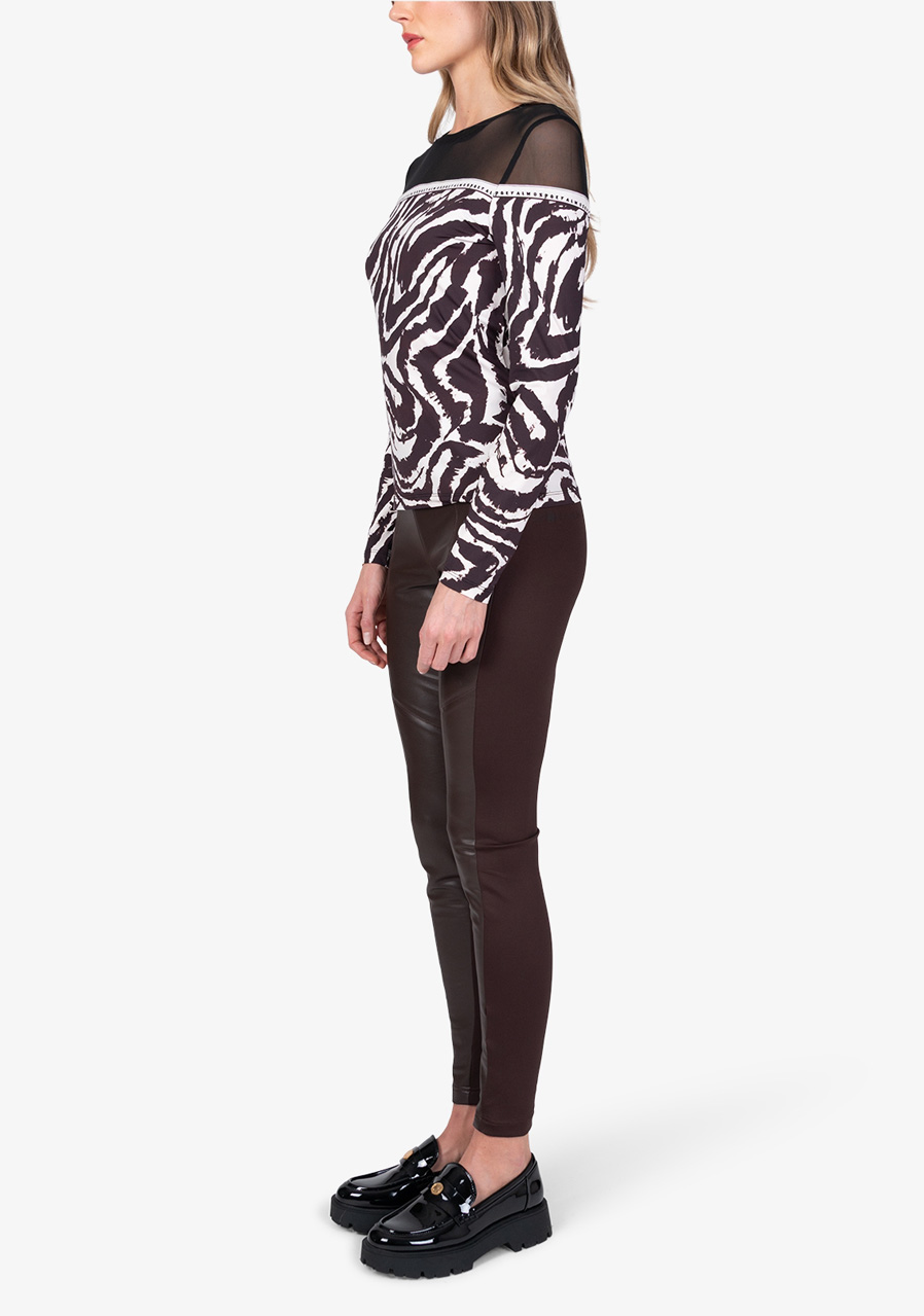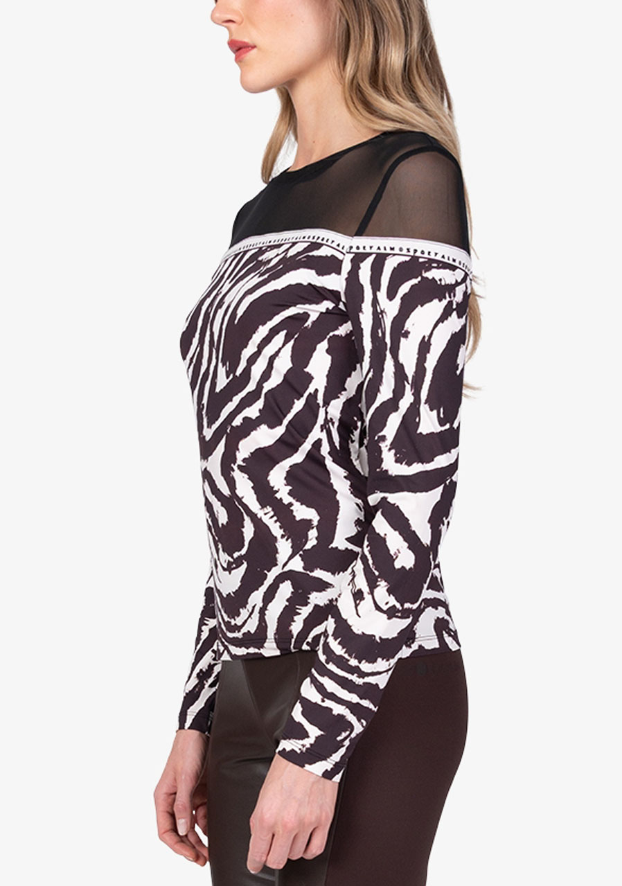 Trendy tričko s dlouhým rukávem zaujme extravagantním vzhledem a výrazným abstraktním zebřím potiskem. Kombinace technického žerzeje a jemně transparentní síťoviny v oblasti ramen dodává modelu lehkost a moderní sofistikovanost. Projmutý střih zvýrazňuje siluetu, zatímco úzké dlouhé rukávy a kulatý výstřih zachovávají čistou, elegantní linii. Výsledkem je módní kousek s výrazným charakterem typickým pro Sportalm.