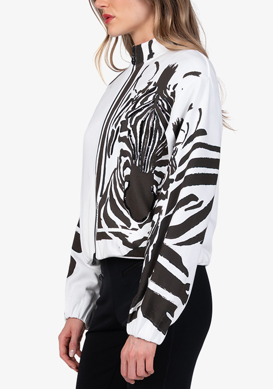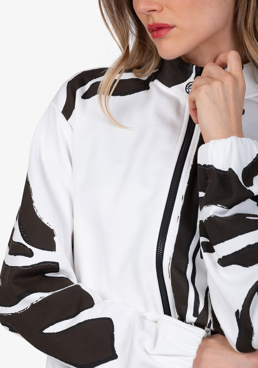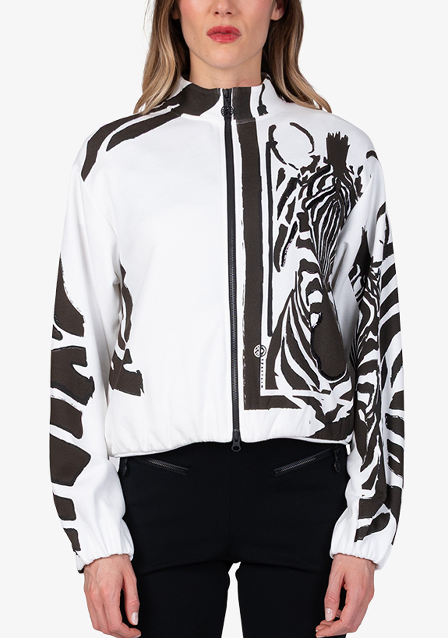 Moderní mikinová bunda z pohodlné bavlněné sweat tkaniny zaujme výrazným abstraktním zebřím potiskem a současnou siluetou. Přiléhavější střih zvýrazňuje postavu, zatímco spadlá ramena a dlouhé, širší rukávy dodávají modelu ležérně sportovní charakter. Stojáček u krku a viditelný dvoucestný zip podtrhují dynamický vzhled vhodný pro každodenní nošení. Kreativní potisk s dekorativními prvky a silikonový logo transfer Sportalm dotvářejí trendový celek.