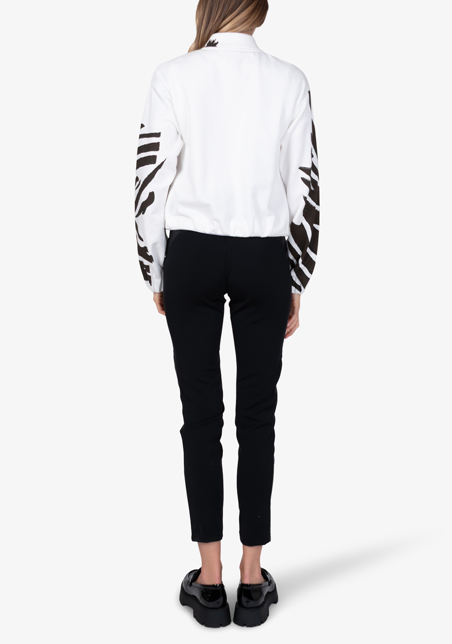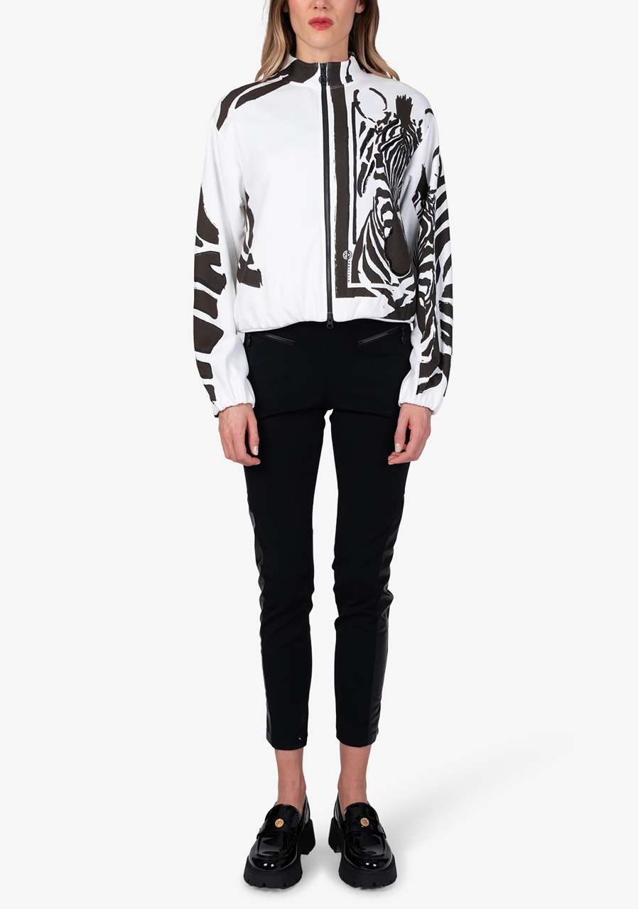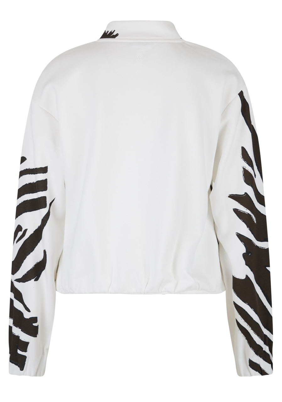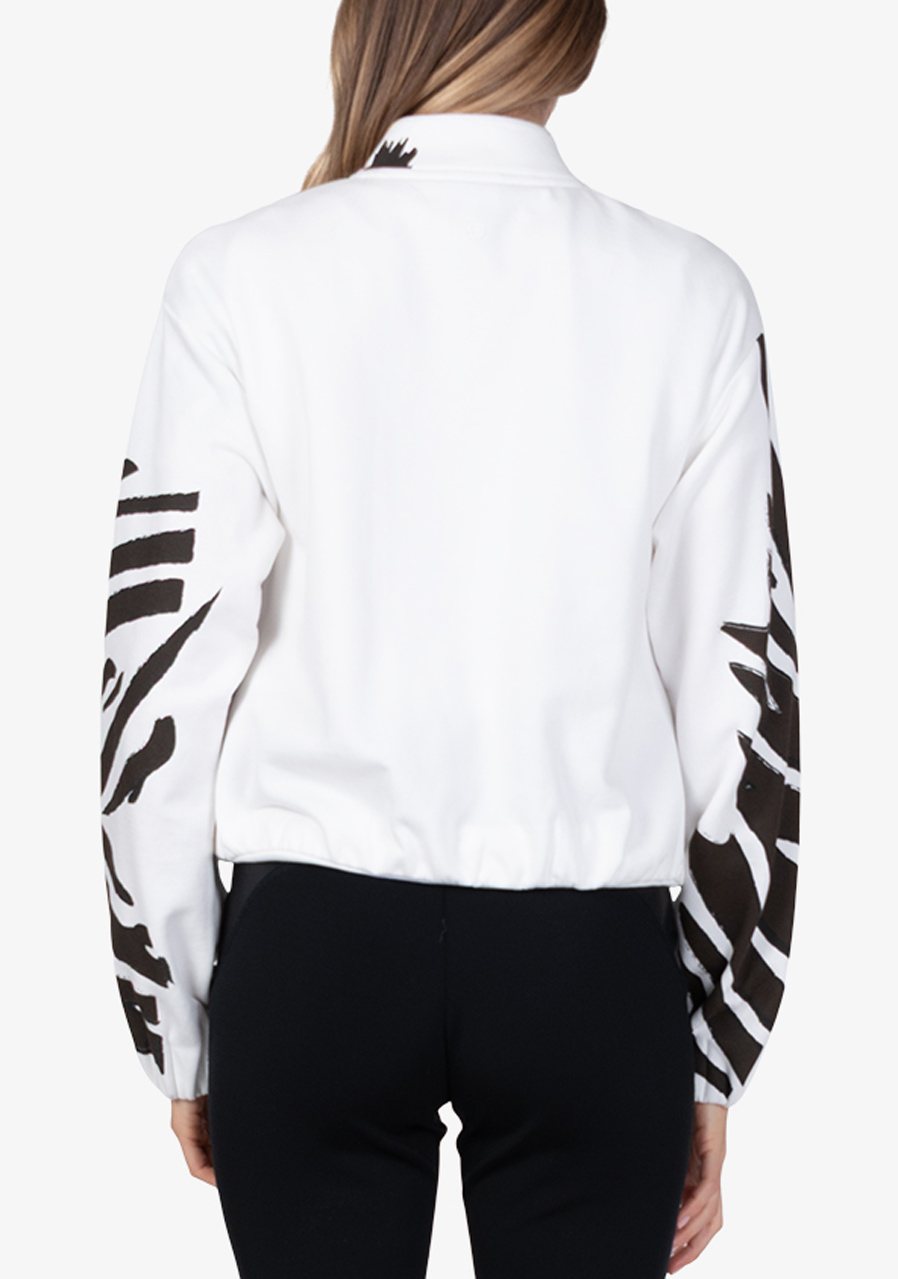Moderní mikinová bunda z pohodlné bavlněné sweat tkaniny zaujme výrazným abstraktním zebřím potiskem a současnou siluetou. Přiléhavější střih zvýrazňuje postavu, zatímco spadlá ramena a dlouhé, širší rukávy dodávají modelu ležérně sportovní charakter. Stojáček u krku a viditelný dvoucestný zip podtrhují dynamický vzhled vhodný pro každodenní nošení. Kreativní potisk s dekorativními prvky a silikonový logo transfer Sportalm dotvářejí trendový celek.