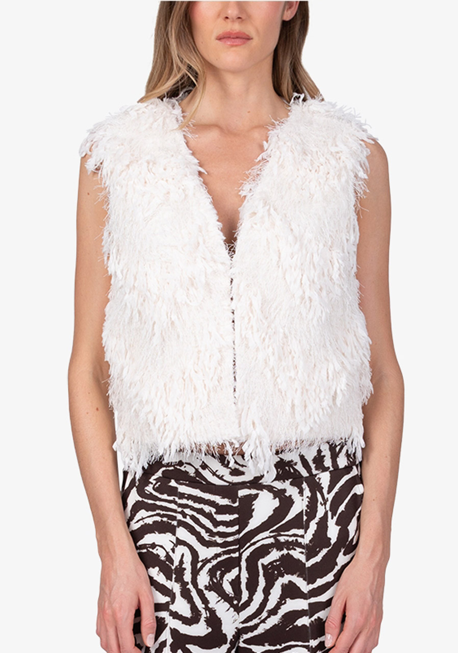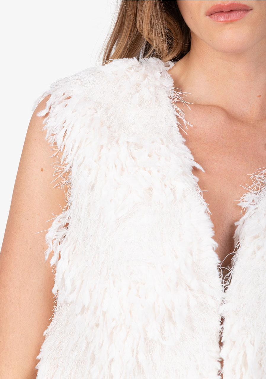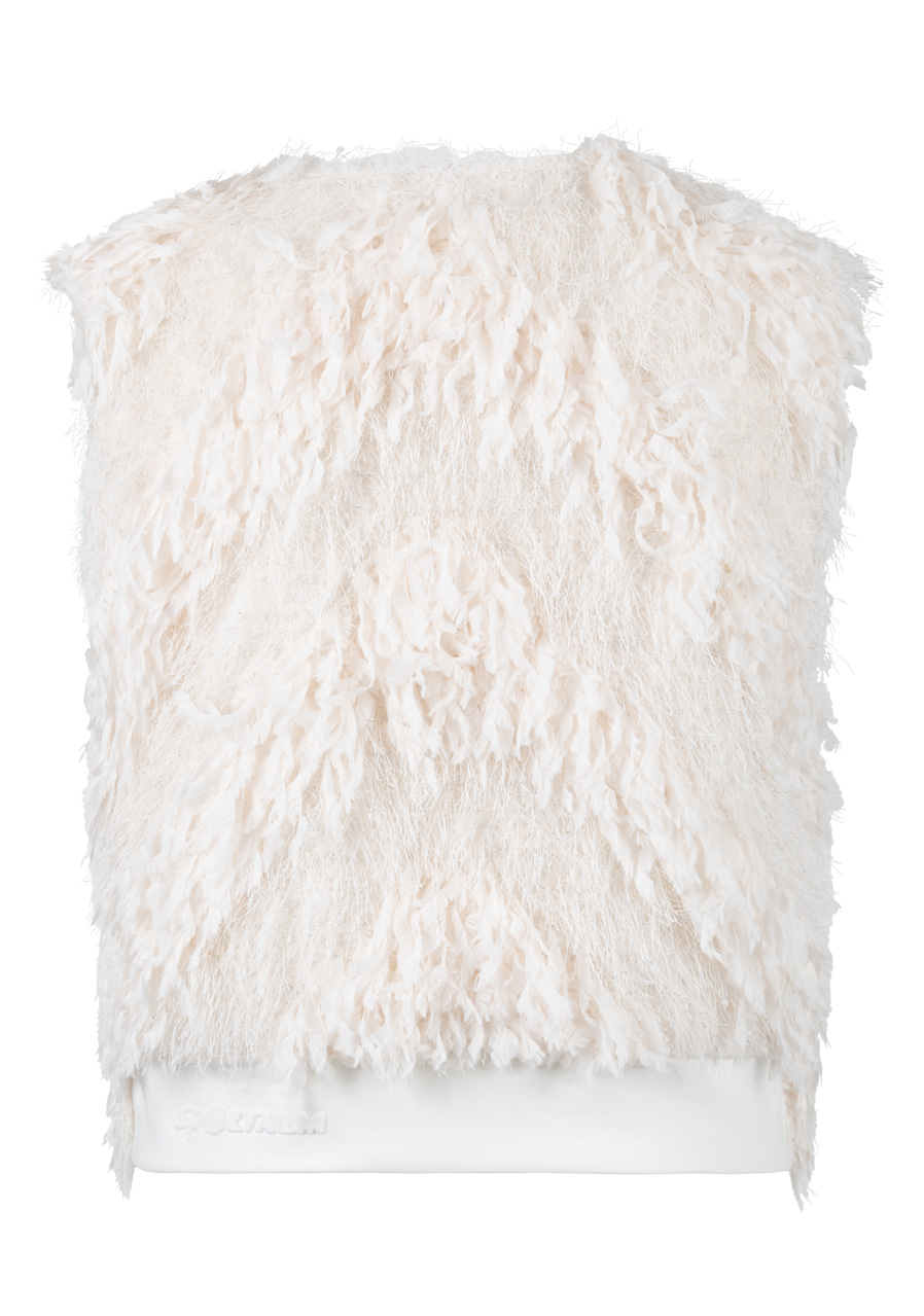 Tato výjimečná dámská vesta z extravagantního třásňového materiálu je navržena tak, aby okamžitě pozvedla každý outfit. Kombinuje ženskou eleganci s trendovým charakterem a díky jemně volnému, postavu obepínajícímu střihu působí moderně a sofistikovaně. V-výstřih prodlužuje siluetu a přední zapínání na háček zajišťuje čistý, minimalistický vzhled. Ramenní oblast je zvýrazněna drobnou légou a zadní díl zakončuje pasový lem s embossovaným Sportalm nápisem. Přední díl je navíc mírně prodloužený pro ještě zajímavější efekt. Vesta je podšitá měkkou sweat tkaninou, která poskytuje vysoký komfort při nošení.