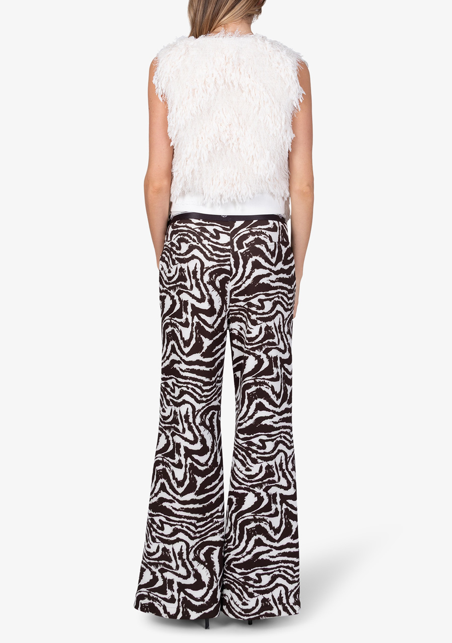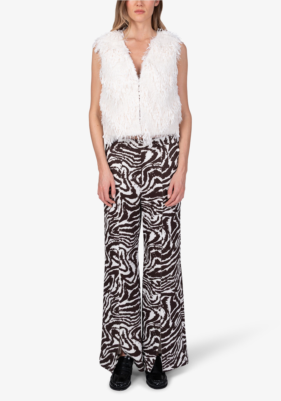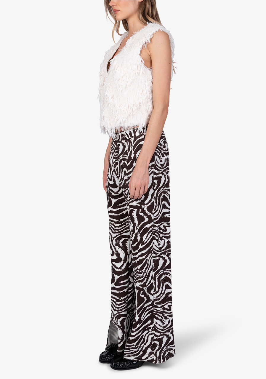 Tato výjimečná dámská vesta z extravagantního třásňového materiálu je navržena tak, aby okamžitě pozvedla každý outfit. Kombinuje ženskou eleganci s trendovým charakterem a díky jemně volnému, postavu obepínajícímu střihu působí moderně a sofistikovaně. V-výstřih prodlužuje siluetu a přední zapínání na háček zajišťuje čistý, minimalistický vzhled. Ramenní oblast je zvýrazněna drobnou légou a zadní díl zakončuje pasový lem s embossovaným Sportalm nápisem. Přední díl je navíc mírně prodloužený pro ještě zajímavější efekt. Vesta je podšitá měkkou sweat tkaninou, která poskytuje vysoký komfort při nošení.