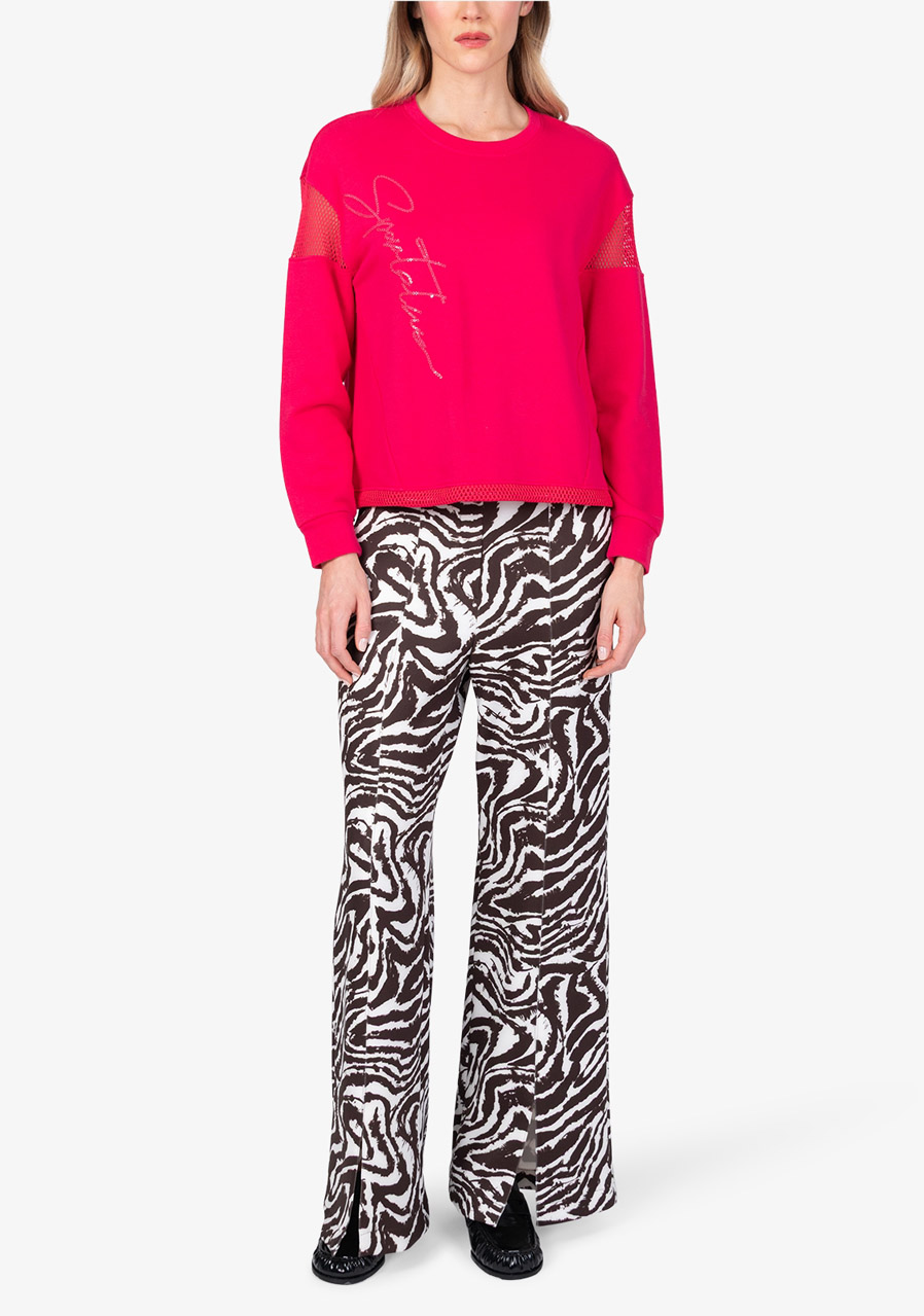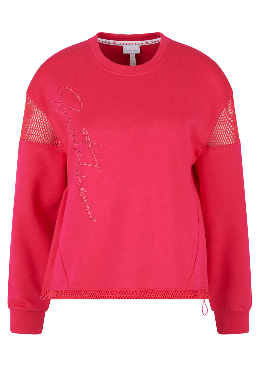 Stylová mikina z letní bavlněné teplákoviny zaujme originální kombinací sportovního charakteru a extravagantních detailů. Jemné síťované vsadky na spadlých ramenou dodávají modelu lehkost a moderní vzhled, zatímco bohatá výšivka s integrovanými flitry vytváří elegantní akcent. Volnější, casual střih zajišťuje pohodlí při nošení a stahování ve spodním lemu umožňuje upravit šířku podle potřeby. Výrazným prvkem je vyšívaný nápis Sportalm, který podtrhuje prémiový charakter tohoto kousku.