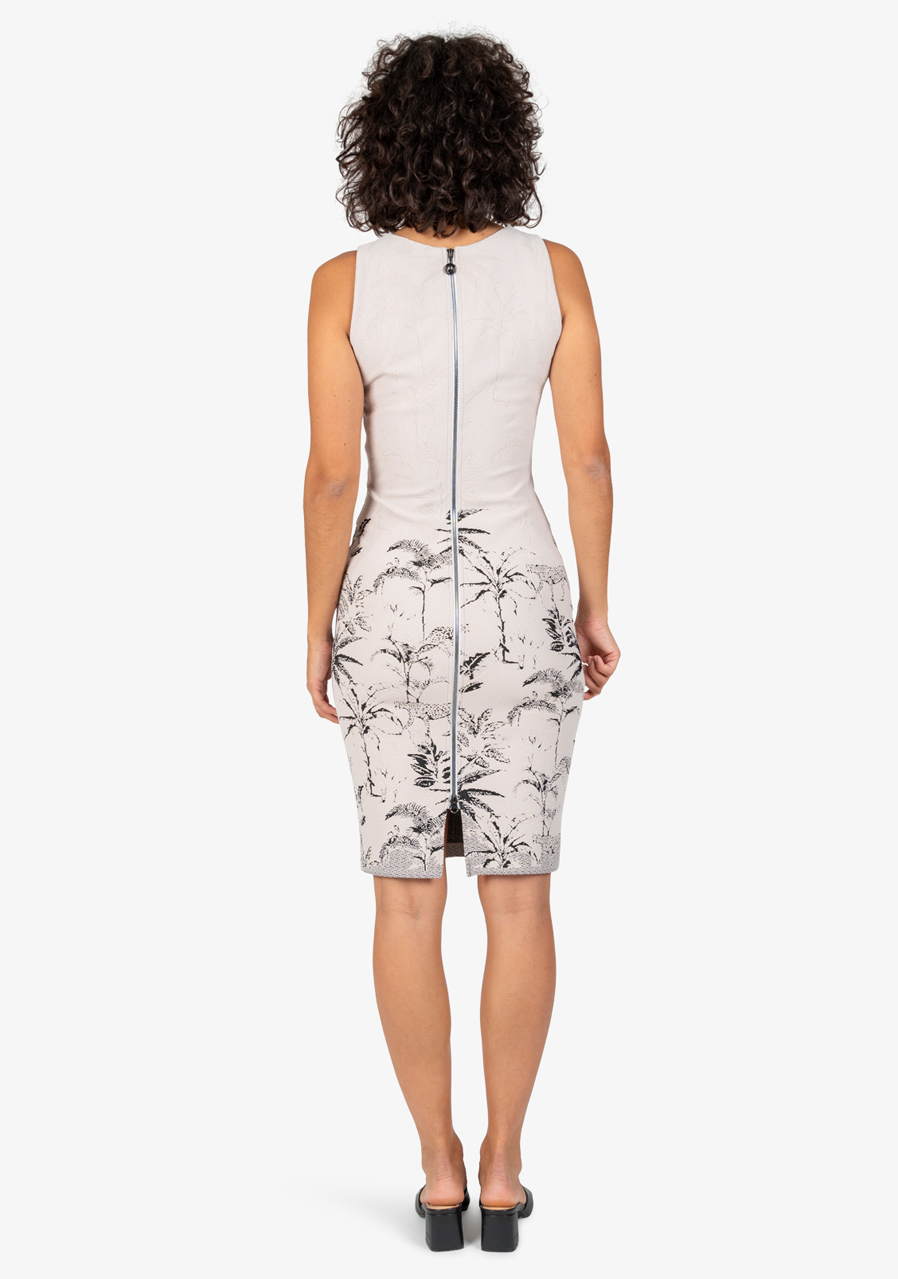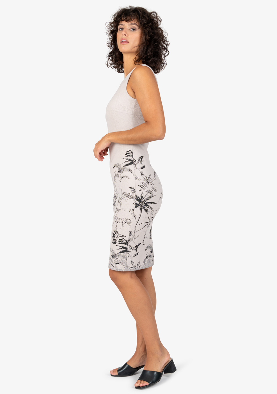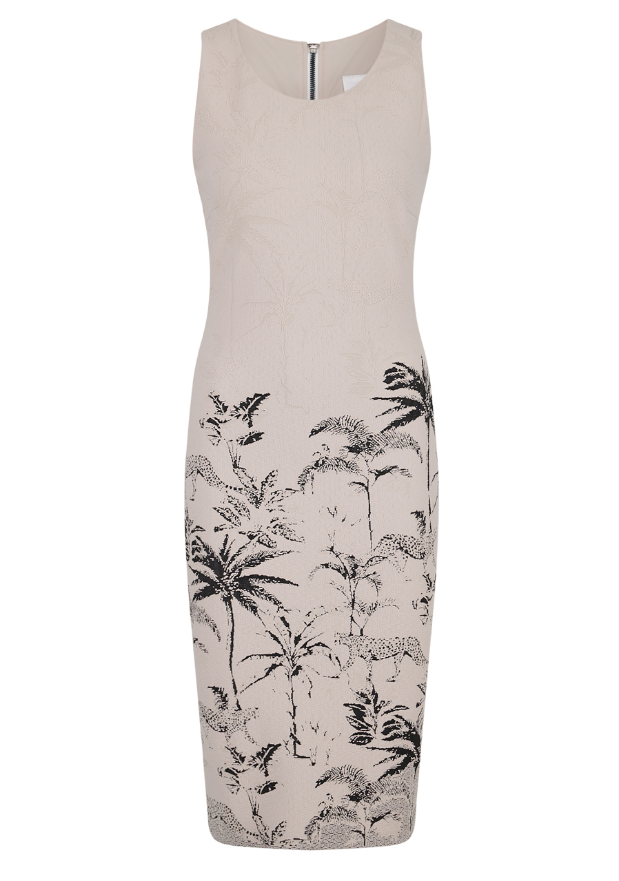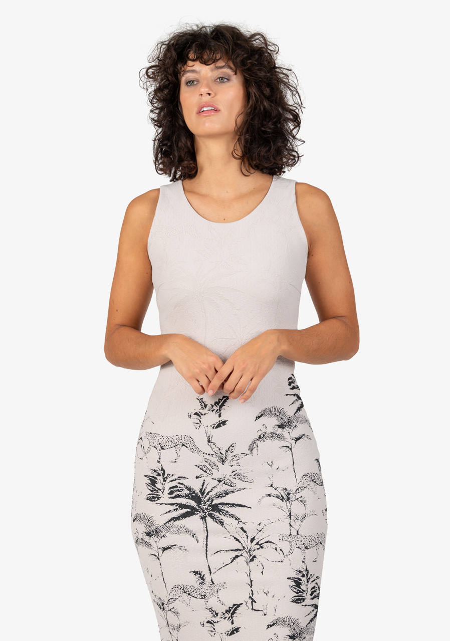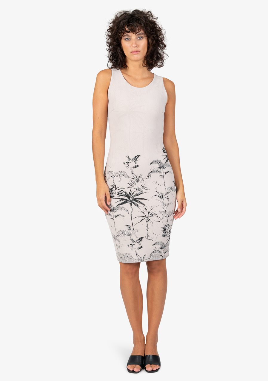 Dámské šaty Sportalm 550162 String s letním designem a bez rukávů jsou ideální pro horké letní dny. Jsou vyrobené z pohodlné strečové žakárové tkaniny s propracovaným palmovým tygřím vzorem na lemu, což dodává šatům unikátní vzhled. Díky přiléhavému střihu a sportovnímu stylu působí šaty moderně a elegantně.