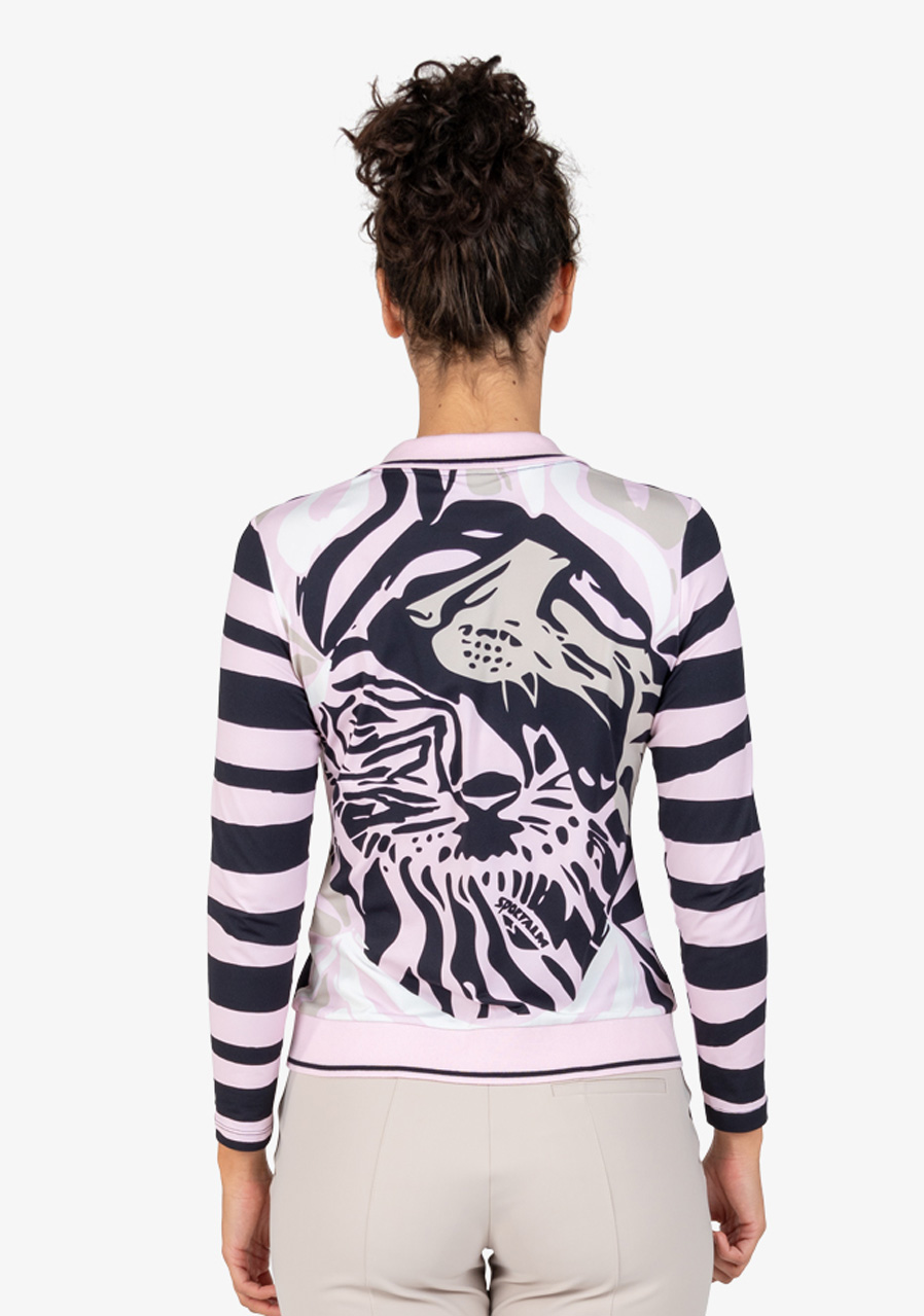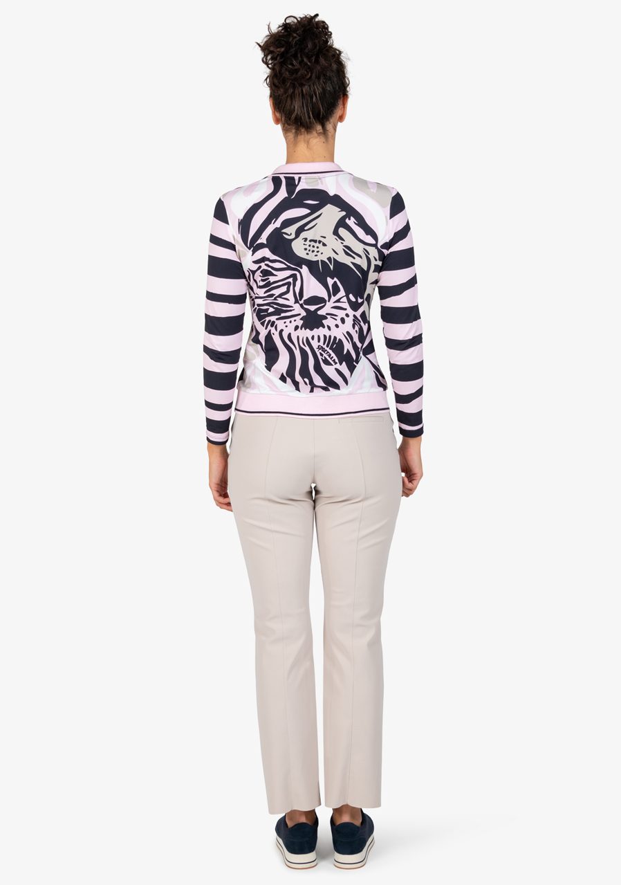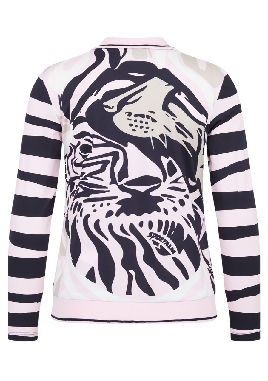 Další parametry: Zadní díl je zdobený extravagantním potiskem hlavy tygra, který přitahuje pozornost a dává modelu unikátní charakter. Rukávy s pruhovaným potiskem dodávají mikině sportovní nádech, zatímco pletený polo límec s výstřihem do V a výrazné pruhy na manžetách podtrhují trendy vzhled. Sportovní a uvolněný střih s dlouhými úzkými rukávy je nejen pohodlný, ale také moderní a stylový. Tričko je ideální pro ležérní, ale přitom elegantní outfity.
