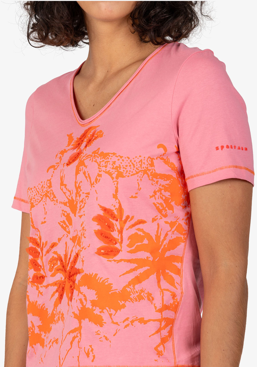 Dámské tričko Sportalm 250165 Pink Dawn je ideální letní kousek s výrazným džunglovým potiskem, který vás přenese přímo do tropických dnů. Je vyrobeno z měkkého bavlněného žerzeje a zdobí ho šifonové aplikace a flitry na přední straně, což dodává triku stylový a moderní vzhled.