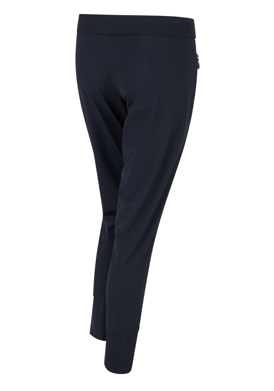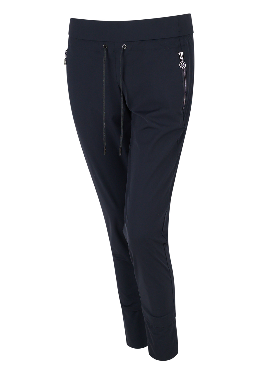 Tyto dámské kalhoty spojují pohodlí s elegantním vzhledem. Lichotivý střih krásně zvýrazňuje postavu, zatímco měkký strečový materiál zajišťuje maximální komfort při nošení. Úzké nohavice zakončené manžetami a praktické kapsy na zip podtrhují moderní a funkční styl.