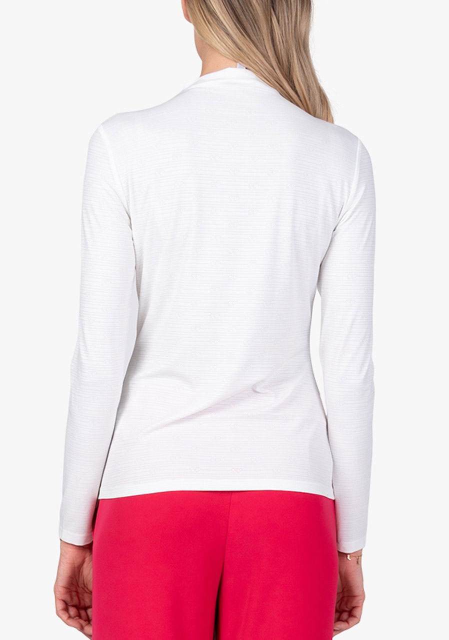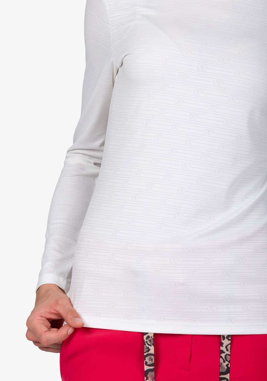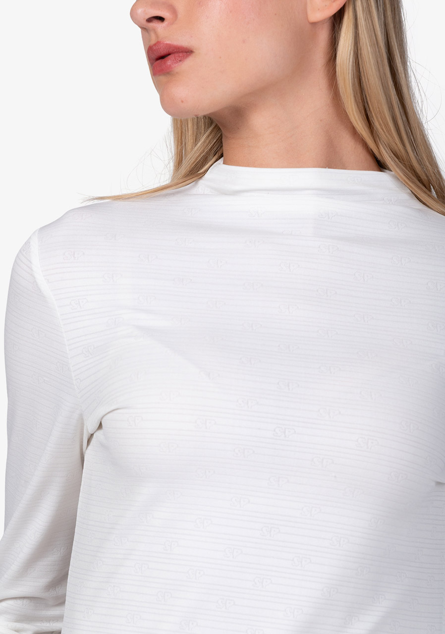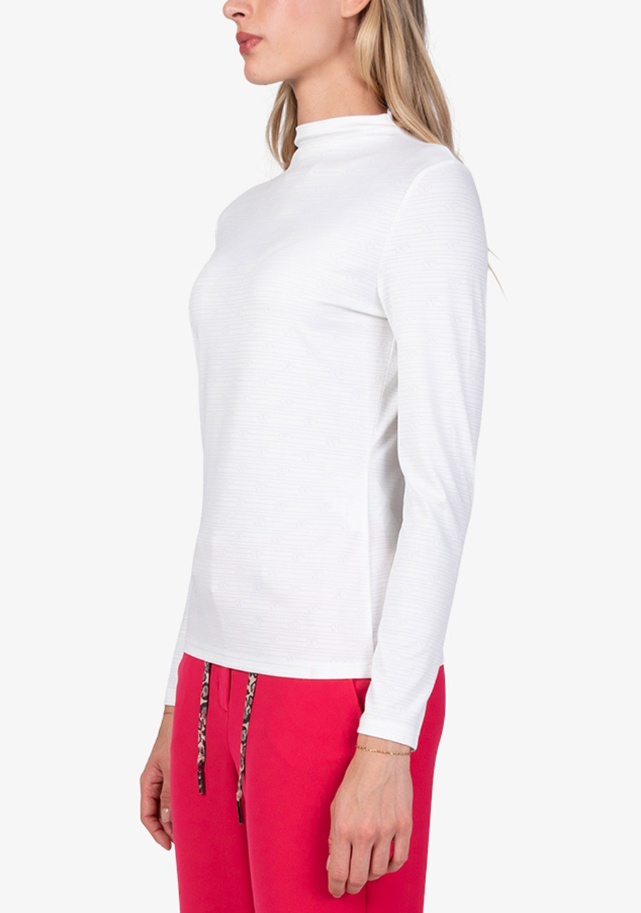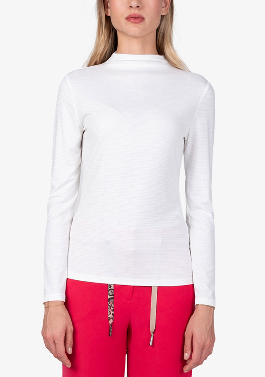 Parametry: Materiál: vysoce kvalitní žerzej Složení: 92 % polyamid, 8 % elastan Design: jemný žakárový vzor s logem Sportalm Střih: přiléhavý Výstřih: stojáček Rukávy: dlouhé, úzké Délka zadní části (vel. 36): 62 cm Styl: nadčasový, ženský, elegantní Sezóna: Fall/Winter 2025