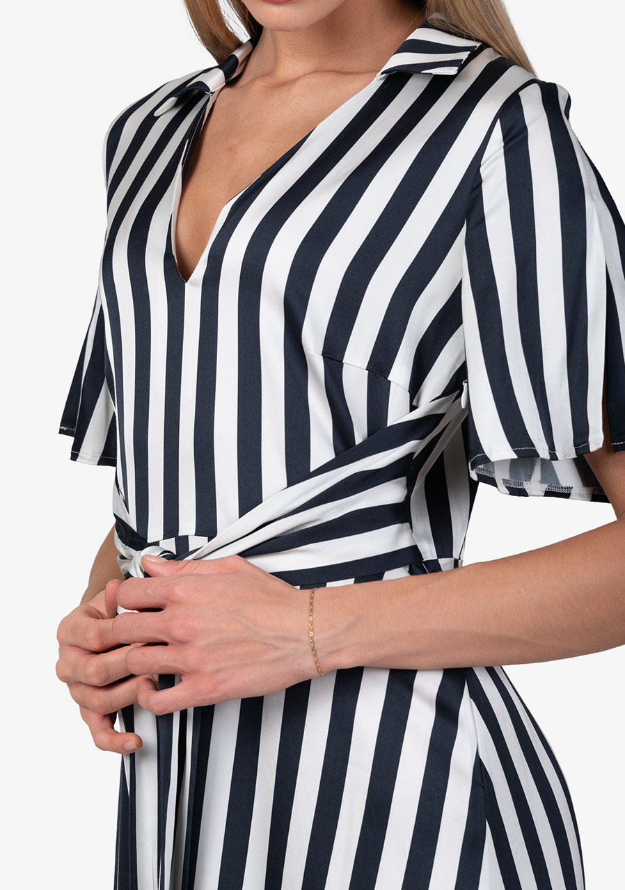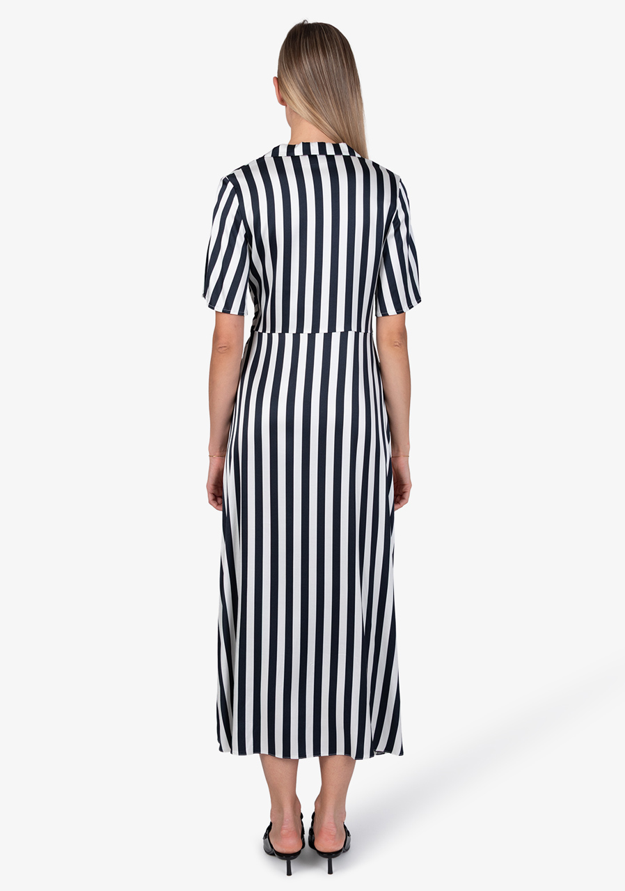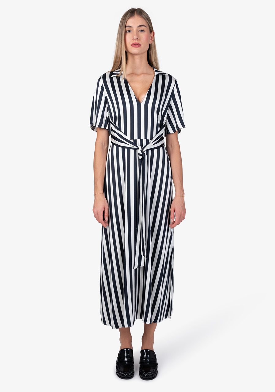 Vzdušné pruhované šaty v moderně-feminím stylu jsou ideální volbou pro letní dny. Lehká tkaná kvalita s vysokým podílem viskózy příjemně splývá, zatímco lehce projmutý střih spolu s vázacím páskem zvýrazňuje siluetu v pase. Košilový límec s V-výstřihem dodává šatům elegantní, ale stále uvolněný charakter. Postranní rozparky zajišťují komfort při pohybu a podtrhují současný vzhled tohoto letního modelu.
