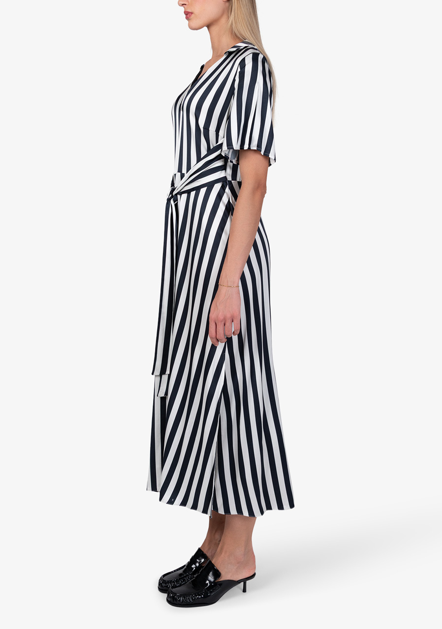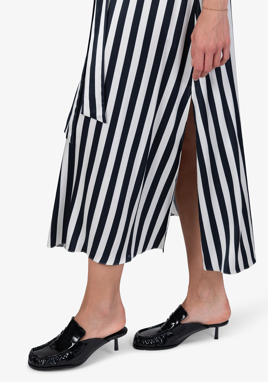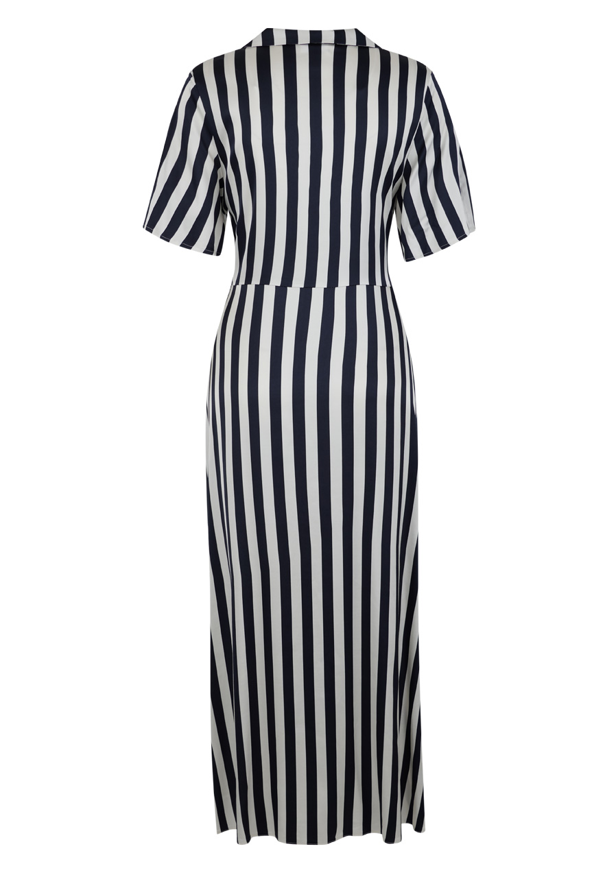 Vzdušné pruhované šaty v moderně-feminím stylu jsou ideální volbou pro letní dny. Lehká tkaná kvalita s vysokým podílem viskózy příjemně splývá, zatímco lehce projmutý střih spolu s vázacím páskem zvýrazňuje siluetu v pase. Košilový límec s V-výstřihem dodává šatům elegantní, ale stále uvolněný charakter. Postranní rozparky zajišťují komfort při pohybu a podtrhují současný vzhled tohoto letního modelu.