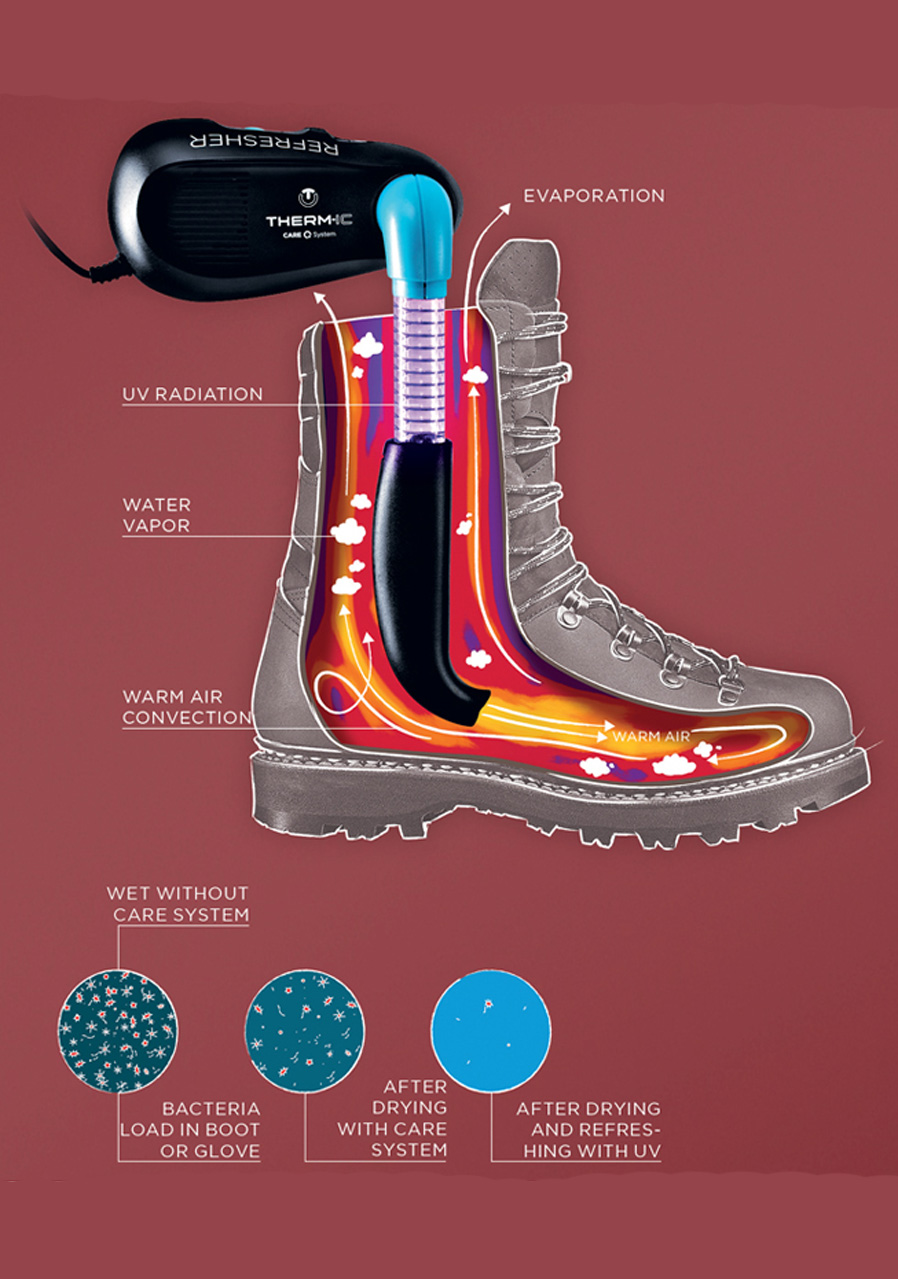Rychlé sušení – výkonný systém ventilace vysuší obuv již za několik hodin, čímž brání vzniku bakterií a zápachu.