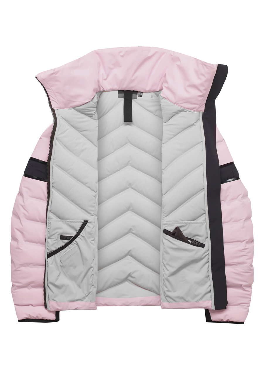 Tato dámská bunda ve Slim Fit střihu kombinuje moderní design s technickými vlastnostmi pro zimní sporty. Vnější materiály Premium Light 4-way Stretch a Nylon Ripstop s Cire finish zajišťují pružnost, odolnost a pohodlí, zatímco kombinovaná izolace PrimaLoft® Down Blend a PrimaLoft® Gold Insulation Active poskytuje optimální teplo i v chladném počasí. Bunda je voděodolná, prodyšná a vybavená praktickými kapsami, sněhovou manžetou a elastickými manžetami s otvory na palce. Odnímatelná kapuce, ochranná klopa u brady, YKK® 2-way VISLON® AquaGuard® zip a elegantní 3D logo dodávají bundě luxusní a technický vzhled.